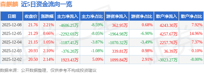 证券之星消息,截至2025年12月8日收盘,森麒麟(002984)报收于21.76元,上涨2.21%,换手率3.44%,成交量24.52万手,成交额5.36亿元。