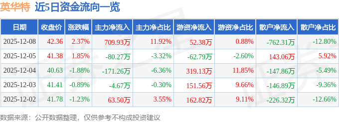 证券之星消息,截至2025年12月8日收盘,英华特(301272)报收于42.36元,上涨2.37%,换手率4.45%,成交量1.4万手,成交额5956.97万元。