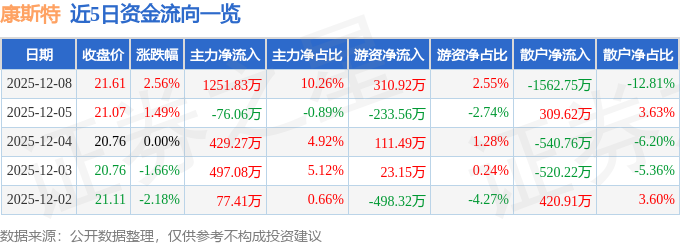 证券之星消息,截至2025年12月8日收盘,康斯特(300445)报收于21.61元,上涨2.56%,换手率4.0%,成交量5.68万手,成交额1.22亿元。
