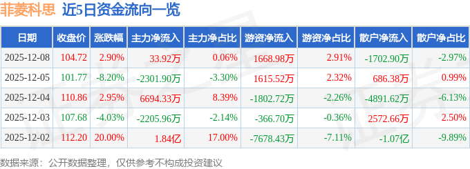 证券之星消息,截至2025年12月8日收盘,菲菱科思(301191)报收于104.72元,上涨2.9%,换手率10.59%,成交量5.53万手,成交额5.74亿元。
