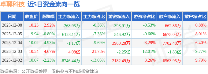 证券之星消息,截至2025年12月8日收盘,卓翼科技(002369)报收于10.23元,上涨2.92%,换手率13.03%,成交量73.79万手,成交额7.5亿元。