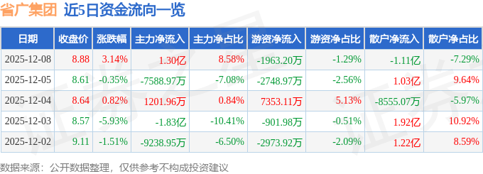 证券之星消息,截至2025年12月8日收盘,省广集团(002400)报收于8.88元,上涨3.14%,换手率10.02%,成交量173.03万手,成交额15.19亿元。