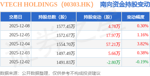 证券之星消息,12月8日南向资金增持4.78万股VTECH HOLDINGS(00303.HK)。近5个交易日中,获南向资金增持的有4天,累计净增持82.82万股。近20个交易日中,获南向资金增持的有17天,累计净增持156.92万股。截至目前,南向资金持有VTECH HOLDINGS(00303.HK)1577.45万股,占公司已发行普通股的6.23%。