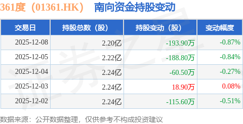 证券之星消息,12月8日南向资金减持193.9万股361度(01361.HK)。近5个交易日中,获南向资金减持的有4天,累计净减持539.9万股。近20个交易日中,获南向资金减持的有16天,累计净减持1410.9万股。截至目前,南向资金持有361度(01361.HK)2.2亿股,占公司已发行普通股的10.62%。