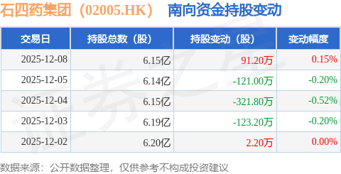 证券之星消息,12月8日南向资金增持91.2万股石四药集团(02005.HK)。近5个交易日中,获南向资金减持的有3天,累计净减持472.6万股。近20个交易日中,获南向资金增持的有13天,累计净增持779.0万股。截至目前,南向资金持有石四药集团(02005.HK)6.15亿股,占公司已发行普通股的20.83%。