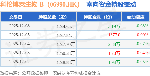 证券之星消息,12月8日南向资金减持3.19万股科伦博泰生物-B(06990.HK)。近5个交易日中,获南向资金减持的有3天,累计净减持6.17万股。近20个交易日中,获南向资金增持的有12天,累计净增持120.63万股。截至目前,南向资金持有科伦博泰生物-B(06990.HK)4244.65万股,占公司已发行普通股的26.07%。