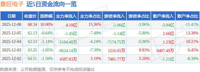 证券之星消息,截至2025年12月8日收盘,景旺电子(603228)报收于68.34元,上涨10.0%,涨停,换手率4.16%,成交量40.57万手,成交额26.67亿元。