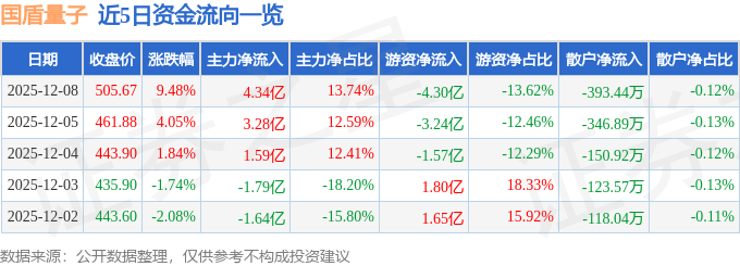 证券之星消息,截至2025年12月8日收盘,国盾量子(688027)报收于505.67元,上涨9.48%,换手率7.98%,成交量6.41万手,成交额31.6亿元。