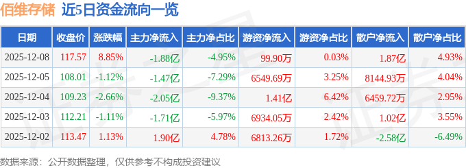 证券之星消息,截至2025年12月8日收盘,佰维存储(688525)报收于117.57元,上涨8.85%,换手率9.3%,成交量32.82万手,成交额37.87亿元。