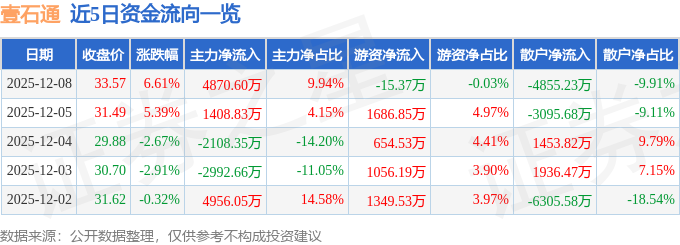 证券之星消息,截至2025年12月8日收盘,壹石通(688733)报收于33.57元,上涨6.61%,换手率7.52%,成交量15.02万手,成交额4.9亿元。