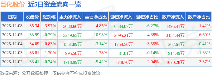 证券之星消息,截至2025年12月8日收盘,巨化股份(600160)报收于35.34元,上涨3.97%,换手率1.11%,成交量29.89万手,成交额10.5亿元。