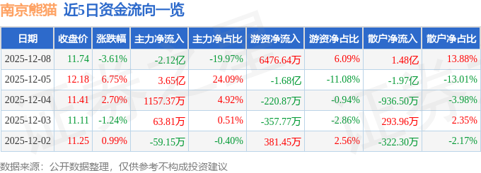 证券之星消息,截至2025年12月8日收盘,南京熊猫(600775)报收于11.74元,下跌3.61%,换手率13.38%,成交量89.86万手,成交额10.64亿元。