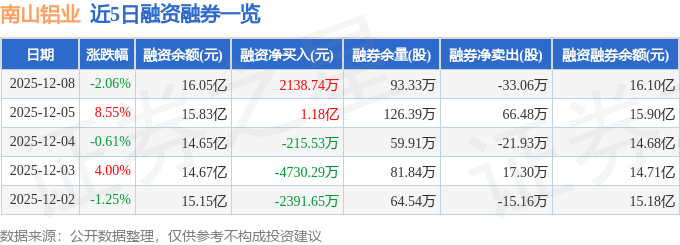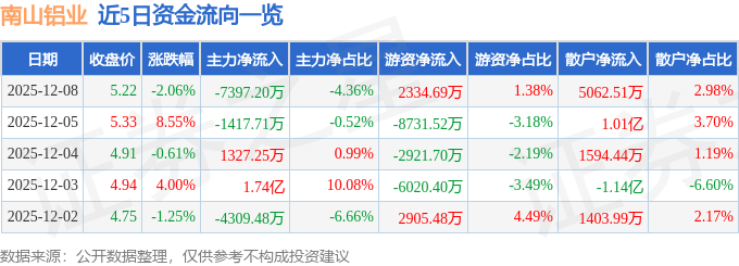 证券之星消息,截至2025年12月8日收盘,南山铝业(600219)报收于5.22元,下跌2.06%,换手率2.81%,成交量325.89万手,成交额16.97亿元。