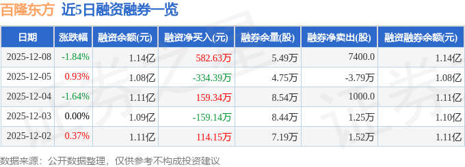 百隆东方融资融券信息显示,融资方面,当日融资买入885.07万元,融资偿还302.44万元,融资净买入582.63万元。融券方面,融券卖出7400.0股,融券偿还0.0股,融券余量5.49万股,融券余额29.32万元。融资融券余额1.14亿元。