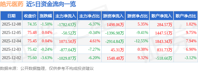 证券之星消息,截至2025年12月8日收盘,皓元医药(688131)报收于74.35元,下跌1.5%,换手率1.77%,成交量3.75万手,成交额2.8亿元。