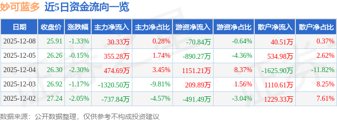 证券之星消息,截至2025年12月8日收盘,妙可蓝多(600882)报收于25.91元,下跌1.33%,换手率0.83%,成交量4.23万手,成交额1.1亿元。