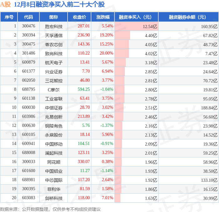 A股融资净买入前三分别为:胜宏科技(300476)融资净买入12.54亿元、天孚通信(300394)融资净买入4.4亿元、香农芯创(300475)融资净买入4.05亿元,前20具体见下表: