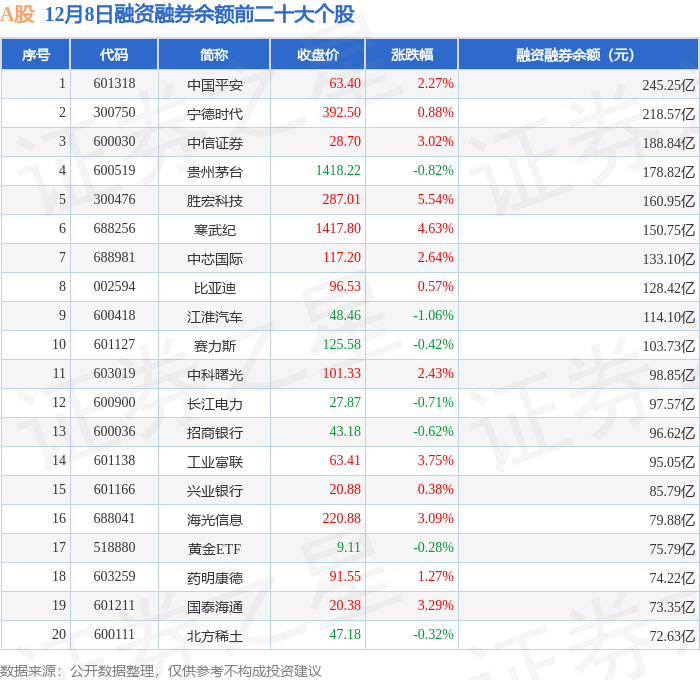 A股融资融券余额前三分别为:中国平安(601318)融资融券余额245.25亿元、宁德时代(300750)融资融券余额218.57亿元、中信证券(600030)融资融券余额188.84亿元,前20具体见下表: