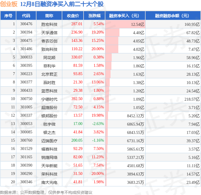 创业板融资净买入前三分别为:胜宏科技(300476)融资净买入12.54亿元、天孚通信(300394)融资净买入4.4亿元、香农芯创(300475)融资净买入4.05亿元,前20具体见下表: