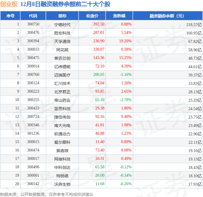创业板融资融券余额前三分别为:宁德时代(300750)融资融券余额218.57亿元、胜宏科技(300476)融资融券余额160.95亿元、天孚通信(300394)融资融券余额67.82亿元,前20具体见下表: