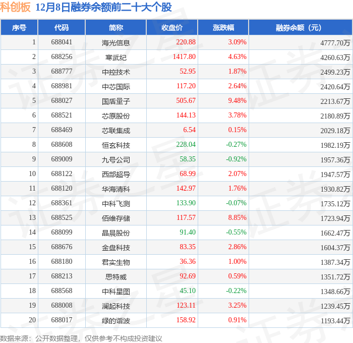 科创板融券余额前三分别为:海光信息(688041)融券余额4777.7万元、寒武纪(688256)融券余额4260.63万元、中控技术(688777)融券余额2499.23万元,前20具体见下表: