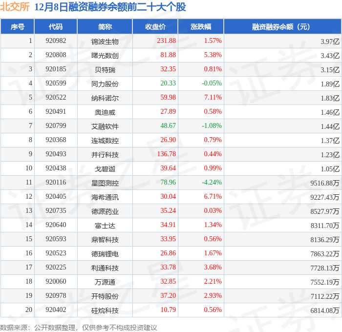 北交所融资融券余额前三分别为:锦波生物(920982)融资融券余额3.97亿元、曙光数创(920808)融资融券余额3.43亿元、贝特瑞(920185)融资融券余额3.15亿元,前20具体见下表: