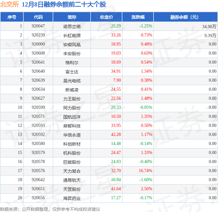 北交所融券余额前三分别为:诺思兰德(920047)融券余额34.9万元、长虹能源(920239)融券余额9.39万元,前20具体见下表: