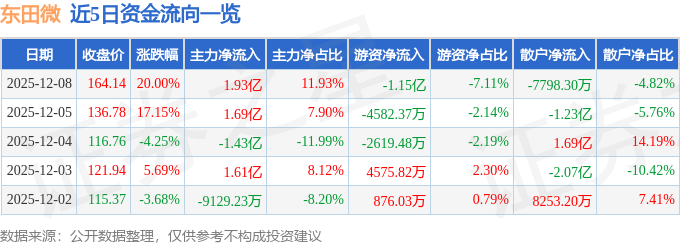 证券之星消息,截至2025年12月8日收盘,东田微(301183)报收于164.14元,上涨20.0%,涨停,换手率18.01%,成交量10.56万手,成交额16.19亿元。