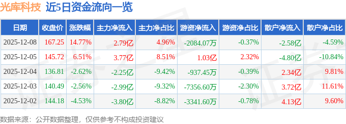 证券之星消息,截至2025年12月8日收盘,光库科技(300620)报收于167.25元,上涨14.77%,换手率14.24%,成交量35.19万手,成交额56.24亿元。