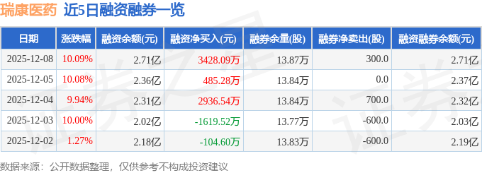 瑞康医药融资融券信息显示,融资方面,当日融资买入1.94亿元,融资偿还1.6亿元,融资净买入3428.09万元,连续3日净买入累计6849.9万元。融券方面,融券卖出600.0股,融券偿还300.0股,融券余量13.87万股,融券余额65.05万元。融资融券余额2.71亿元。