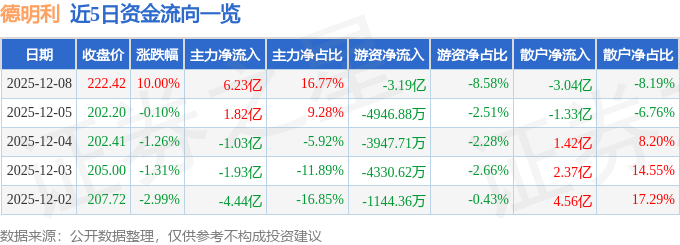 证券之星消息,截至2025年12月8日收盘,德明利(001309)报收于222.42元,上涨10.0%,涨停,换手率10.66%,成交量17.14万手,成交额37.15亿元。