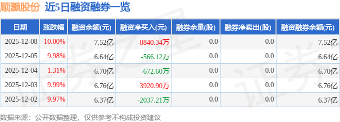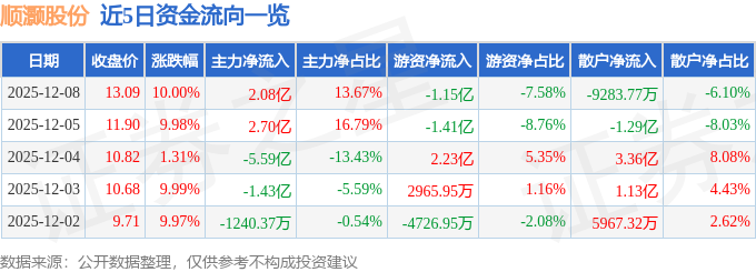 证券之星消息,截至2025年12月8日收盘,顺灏股份(002565)报收于13.09元,上涨10.0%,已连续涨停2天,换手率10.98%,成交量116.42万手,成交额15.22亿元。