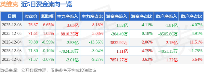 证券之星消息,截至2025年12月8日收盘,英维克(002837)报收于76.37元,上涨6.65%,换手率6.92%,成交量58.8万手,成交额44.38亿元。
