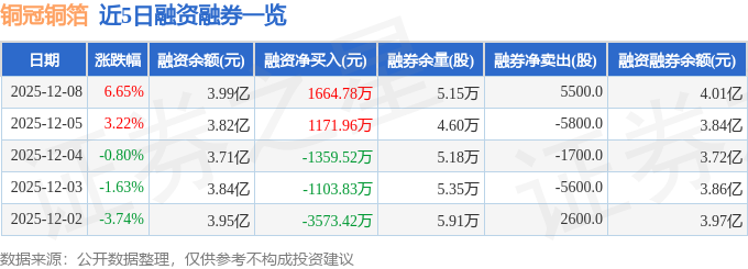 铜冠铜箔融资融券信息显示,融资方面,当日融资买入1.42亿元,融资偿还1.25亿元,融资净买入1664.78万元。融券方面,融券卖出1.36万股,融券偿还8100.0股,融券余量5.15万股,融券余额169.23万元。融资融券余额4.01亿元。