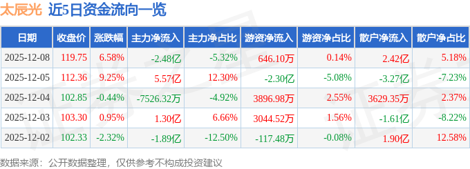 证券之星消息,截至2025年12月8日收盘,太辰光(300570)报收于119.75元,上涨6.58%,换手率20.42%,成交量39.24万手,成交额46.69亿元。