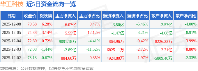 证券之星消息,截至2025年12月8日收盘,华工科技(000988)报收于79.58元,上涨6.28%,换手率8.05%,成交量80.89万手,成交额64.1亿元。