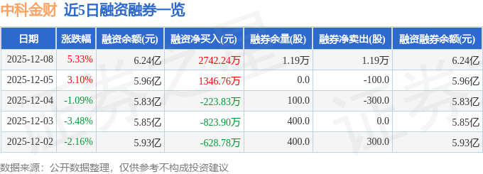 中科金财融资融券信息显示,融资方面,当日融资买入9419.45万元,融资偿还6677.21万元,融资净买入2742.24万元。融券方面,融券卖出1.19万股,融券偿还0.0股,融券余量1.19万股,融券余额32.93万元。融资融券余额6.24亿元。