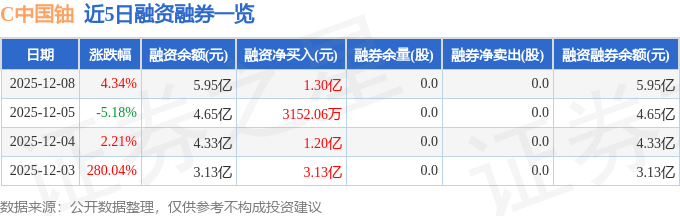 C中国铀融资融券信息显示,融资方面,当日融资买入4.15亿元,融资偿还2.85亿元,融资净买入1.3亿元,连续3日净买入累计2.81亿元。融券方面,融券卖出0.0股,融券偿还0.0股,融券余量0.0股,融券余额0.0万元。融资融券余额5.95亿元。