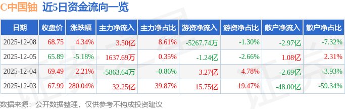 证券之星消息,截至2025年12月8日收盘,C中国铀(001280)报收于68.75元,上涨4.34%,换手率38.19%,成交量60.37万手,成交额40.58亿元。