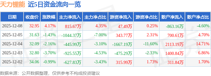 证券之星消息,截至2025年12月8日收盘,天力锂能(301152)报收于32.95元,上涨4.17%,换手率8.13%,成交量5.77万手,成交额1.88亿元。