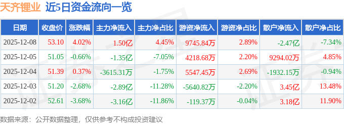 证券之星消息,截至2025年12月8日收盘,天齐锂业(002466)报收于53.1元,上涨4.02%,换手率4.34%,成交量64.0万手,成交额33.69亿元。