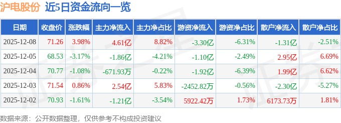 证券之星消息,截至2025年12月8日收盘,沪电股份(002463)报收于71.26元,上涨3.98%,换手率3.86%,成交量74.31万手,成交额52.31亿元。