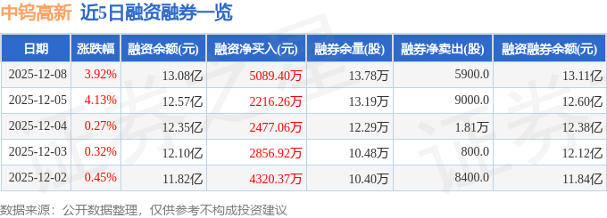 中钨高新融资融券信息显示,融资方面,当日融资买入3.67亿元,融资偿还3.16亿元,融资净买入5089.4万元,连续3日净买入累计9782.72万元。融券方面,融券卖出1.43万股,融券偿还8400.0股,融券余量13.78万股,融券余额332.15万元。融资融券余额13.11亿元。