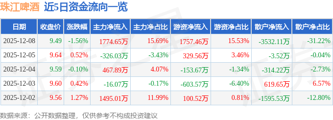 证券之星消息,截至2025年12月8日收盘,珠江啤酒(002461)报收于9.49元,下跌1.56%,换手率0.54%,成交量11.94万手,成交额1.13亿元。