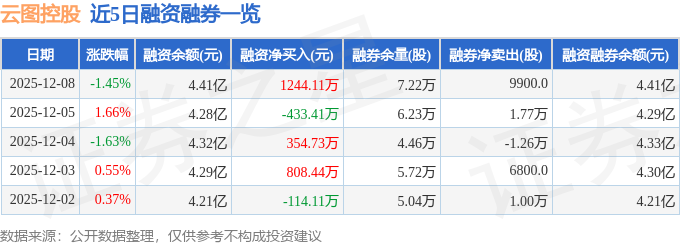 云图控股融资融券信息显示,融资方面,当日融资买入3411.11万元,融资偿还2167.0万元,融资净买入1244.11万元。融券方面,融券卖出1.09万股,融券偿还1000.0股,融券余量7.22万股,融券余额78.41万元。融资融券余额4.41亿元。