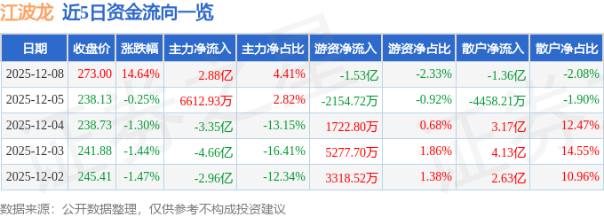 证券之星消息,截至2025年12月8日收盘,江波龙(301308)报收于273.0元,上涨14.64%,换手率9.19%,成交量25.21万手,成交额65.41亿元。