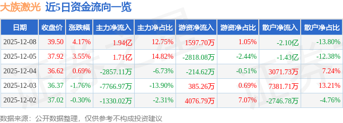 证券之星消息,截至2025年12月8日收盘,大族激光(002008)报收于39.5元,上涨4.17%,换手率4.06%,成交量38.83万手,成交额15.18亿元。