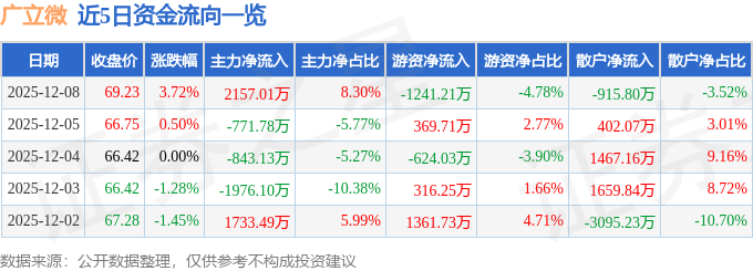 证券之星消息,截至2025年12月8日收盘,广立微(301095)报收于69.23元,上涨3.72%,换手率2.17%,成交量3.78万手,成交额2.6亿元。