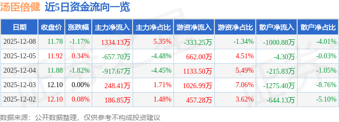 证券之星消息,截至2025年12月8日收盘,汤臣倍健(300146)报收于11.78元,下跌1.17%,换手率1.88%,成交量21.09万手,成交额2.49亿元。