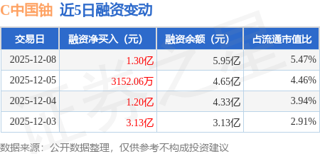 证券之星消息,12月8日,C中国铀(001280)融资买入4.15亿元,融资偿还2.85亿元,融资净买入1.3亿元,融资余额5.95亿元,当日融资净买入排名第36,近3个交易日已连续净买入累计2.81亿元。
